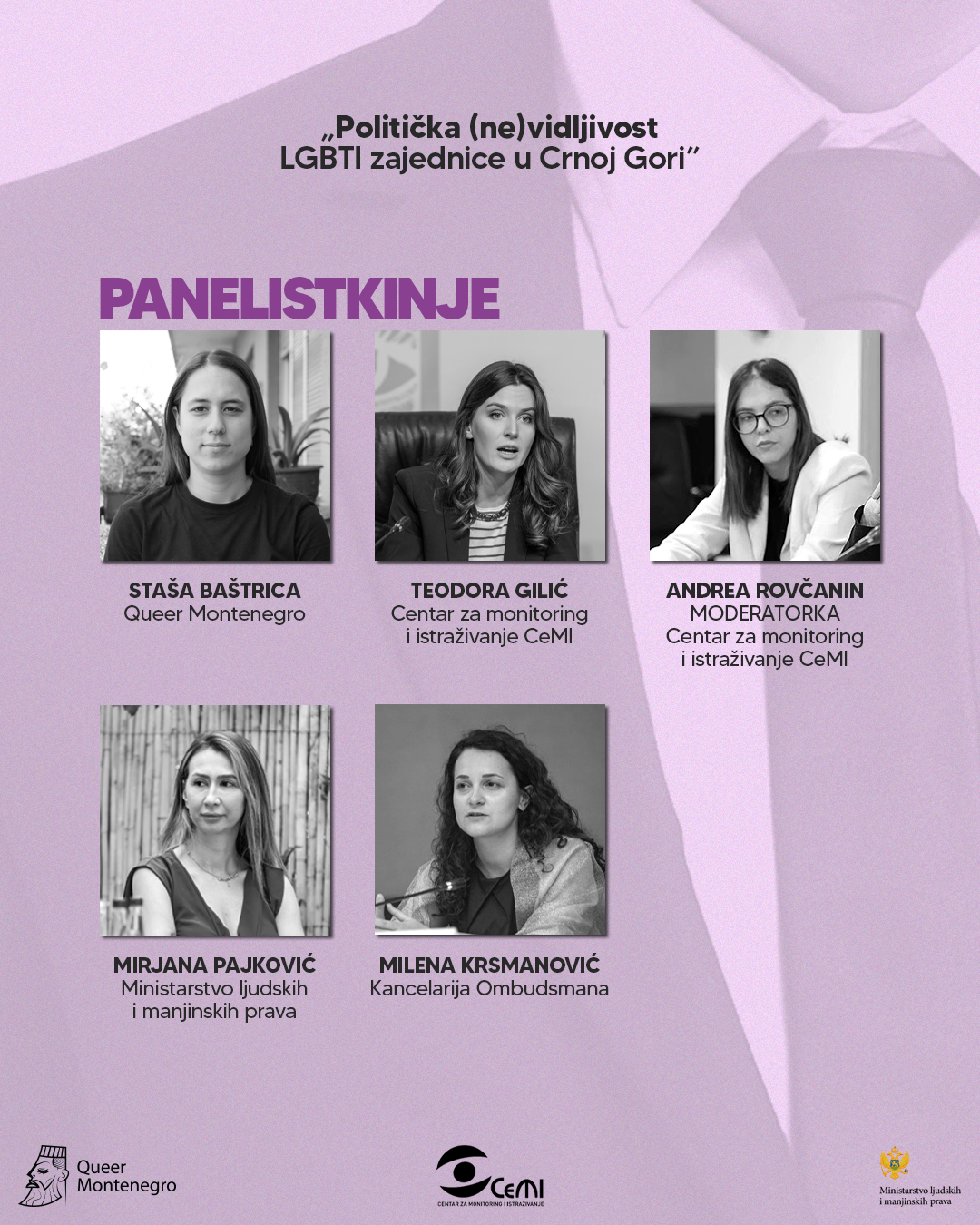 Pridružite nam se na konferenciji „Politička (ne)vidljivost LGBTI zajednice u Crnoj Gori“, u petak, 11. jula, od 10h u hotelu Hilton, Podgorica, koju organizuje Kvir Montenegro u partnerstvu sa Centrom za monitoring i istraživanje - CeMI i uz finansijsku podršku Ministarstva ljudskih i manjinskih prava.