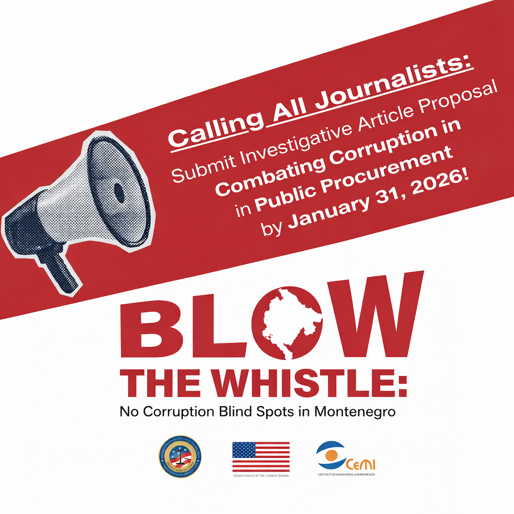 Centar za monitoring i istraživanje (CeMI) poziva novinare i istraživačke novinare da iskažu interesovanje i dostave prijedloge tema za istraživačke priče u oblasti borbe protiv korupcije u oblasti javnih nabavki, u okviru aktivnosti na projektu “𝘿𝙞𝙜𝙣𝙞 𝙜𝙡𝙖𝙨: 𝙯𝙖 𝘾𝙧𝙣𝙪 𝙂𝙤𝙧𝙪 𝙗𝙚𝙯 𝙠𝙤𝙧𝙪𝙥𝙘𝙞𝙟𝙚” podržanog od strane INL kancelarije Ambasade SAD u Podgorici.